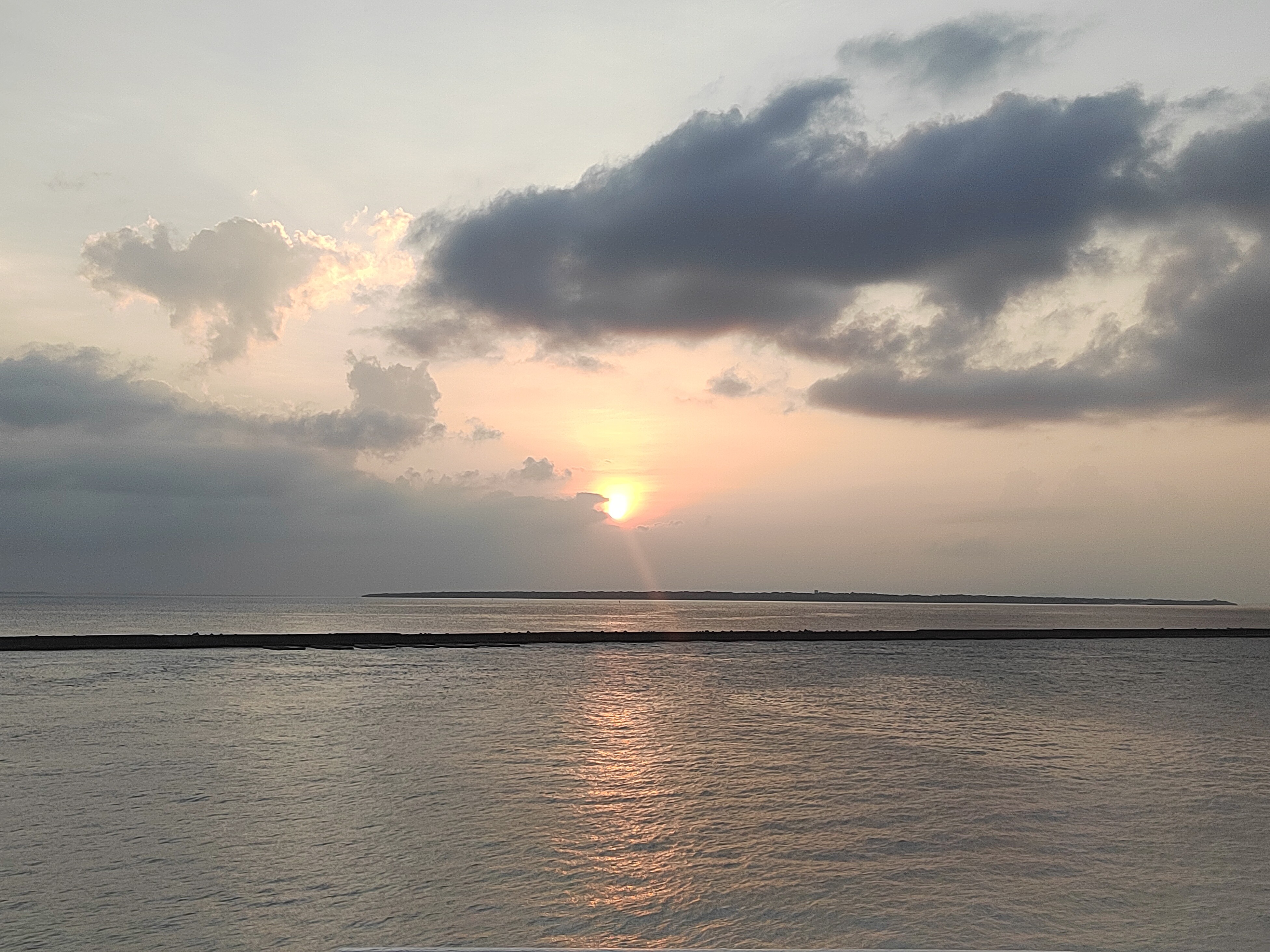 傍晚时分,海平面被夕阳染成一片瑰丽的橘红与金紫。